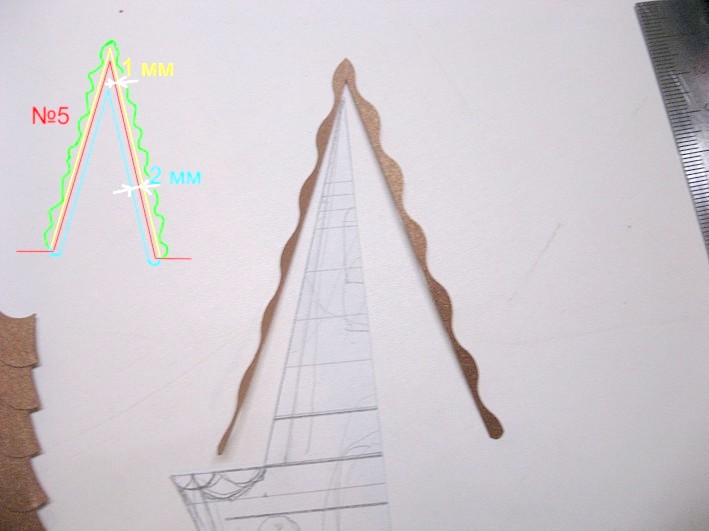 7. Оформляем центральную часть крыши. Обводим скаты по шаблону №5. Делаем отступ внутрь - 2 мм - и проводим линии (голубой цвет на схеме). Делаем отступ наружу - 1 мм - и проводим линии (желтый цвет на схеме). По внутренним линиям вырезаем обычными ножницами. По внешним линиям вырезаем фигурными ножницами (зеленая линия на схеме).