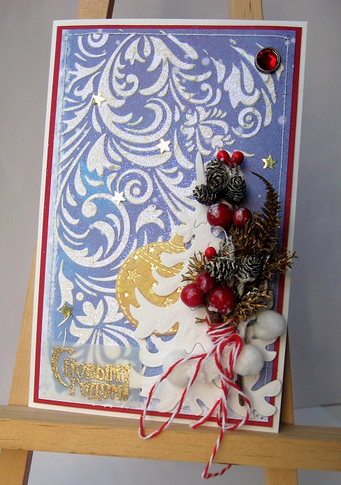 По скрапворду сотворила новогоднюю открыточку, использовала 10 слов. Фон сделан текстурной пастой с глиттером через трафарет. В декоре - вырубка, декоративные ягодки, ольховые шишечки, лента с помпошками, шнур-твайн, декоративная еловая веточка, пайетки-звездочки...