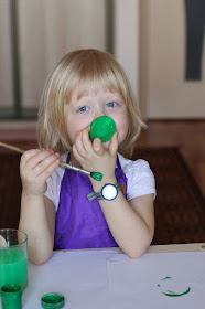 Откладываем нашу зелень на просушку, и приступаем к фону открытки. Как я уже раньше писала, с малышами лучше обойтись без пробигованной основы и выбрать открытку-панно - им удобнее работать с плоской поверхностью. Берем лист картона, можно и акварельную бумагу, но тогда в конце ее надо будет наклеить на основу. На листе я на глаз отмерила треть и провела неровную линию, обозначив "горизонт", где сольются две краски. Объяснила Маше, что сверху у нас небо, а снизу - земля. Исходя из этого и раскрашиваем наш лист горизонтальными мазками кисти. Для неба мы выбрали голубой...