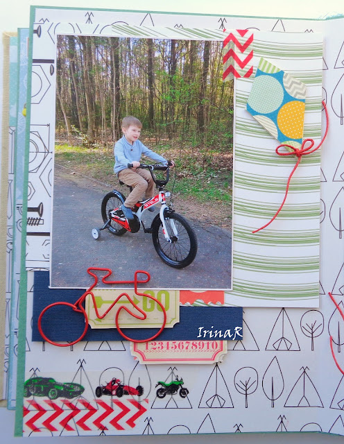 Бумага спокойной цветовой гаммы, за исключением одного "солнечного" листа. А так как я делала альбом для мальчика, то разбавляла это спокойствие секретиками-отворотами и яркими элементами декора - вырубкой, тежиками из картона, чипбордом, уголками под фото, цветные брадс